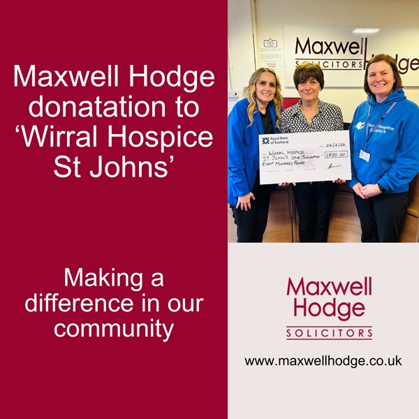 Julia Evans, Giving Manager at Wirral Hospice St John’s recently visited our West Kirby branch, where Candice Jones and Lisa Cockburn proudly presented a cheque for £1,800 on behalf of the Directors at Maxwell Hodge.